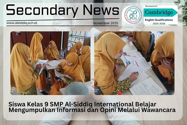 Pada hari Rabu, 5 November 2025, siswa dan siswi kelas 9 SMP Al-Siddiq International melaksanakan kegiatan pembelajaran berbasis proyek dengan topik mengumpulkan informasi dan opini melalui metode wawancara. Kegiatan ini dimulai pukul 08.00 WIB dan dibimbing langsung oleh Mr. Umair Shoddiq, S.I.Kom. Pembelajaran ini mengacu pada buku Global Perspective – Learner’s Skill Book 9 terbitan Cambridge University Press, yang mendorong peserta didik untuk mengembangkan keterampilan berpikir kritis dan komunikasi. Dalam kegiatan ini, siswa mempelajari cara membuat pertanyaan terbuka untuk menggali pendapat dan pandangan orang lain. Pertanyaan yang digunakan antara lain: “Apakah hal ini cocok dengan budaya masyarakat Indonesia? Mengapa?” “Apa pendapatmu mengenai hal ini?” Sebagai dasar diskusi, para siswa menonton sebuah video dokumenter tentang komunitas masyarakat unik di luar negeri. Setelah itu, setiap peserta didik melakukan wawancara kepada minimal lima teman sekelasnya dan mendokumentasikan hasil wawancaranya. Melalui kegiatan ini, siswa tidak hanya berlatih berbicara dan mendengarkan secara aktif, tetapi juga belajar memahami berbagai sudut pandang dan mengembangkan empati terhadap perbedaan budaya di dunia global.By Umair Shoddiq, S.I.Kom