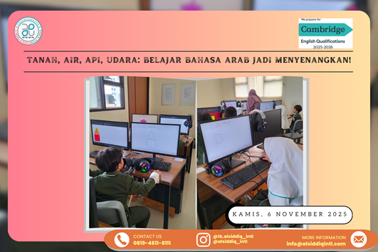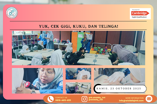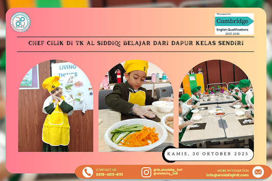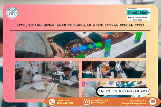 Selasa, 11 November 2025, anak-anak TK B Al Siddiq International mengikuti kegiatan belajar yang sederhana namun sangat bermakna: mengurutkan benda dari yang kecil hingga yang besar. Kegiatan ini berlangsung di dalam kelas Science and Math yang telah disiapkan dengan suasana menyenangkan dan alat bantu visual yang menarik. Meski terlihat seperti permainan biasa, aktivitas ini dirancang untuk membangun dasar pemahaman logika, matematika, dan keterampilan kognitif anak-anak usia dini.Tujuan utama dari kegiatan ini adalah untuk mengenalkan konsep urutan, ukuran, serta keterampilan membandingkan objek berdasarkan ciri tertentu—dalam hal ini ukuran. Bagi anak TK, kemampuan mengurutkan adalah bagian penting dari perkembangan berpikir logis dan pemecahan masalah. Anak-anak belajar bahwa benda bisa diklasifikasikan dan diurutkan, serta bahwa segala sesuatu memiliki pola dan struktur. Ini menjadi landasan bagi pemahaman matematika yang lebih kompleks di masa depan.Pada kesempatan ini, guru memulai kegiatan dengan mengamati kemampuan anak dalam menjumlahkan dan menghitung menggunakan balok LEGO. Kegiatan ini bertujuan untuk menggali sejauh mana pemahaman dasar anak terhadap angka dan konsep jumlah. Namun, sambil menunggu giliran, anak-anak diminta mengerjakan worksheet yang telah disiapkan oleh guru yang tidak kalah seru: mengurutkan gambar benda dari ukuran kecil hingga besar.Dengan antusias, anak-anak memegang satu per satu gambar—mulai dari gambar mobil dan suntikan —dan mencoba menyusunnya dalam urutan yang tepat. Beberapa anak langsung paham, sementara yang lain berdiskusi kecil dengan temannya atau bertanya kepada guru. Aktivitas ini juga mengasah keterampilan sosial mereka, seperti kerja sama, menunggu giliran, dan berani mengemukakan pendapat.Kegiatan hari itu ditutup dengan refleksi ringan dari guru, memberikan pujian atas usaha anak-anak, dan menjelaskan kembali secara singkat manfaat dari apa yang mereka lakukan. Anak-anak terlihat bangga dengan hasil karyanya, dan suasana kelas penuh dengan semangat belajar. Melalui kegiatan sederhana seperti ini, TK B Al Siddiq International terus berupaya menanamkan dasar-dasar penting dalam proses berpikir dan belajar anak secara menyenangkan dan bermakna.By Inka Amalia, S.Pd