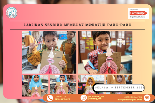 Untuk membantu anak-anak memahami cara kerja paru-paru, TK Al Siddiq melakukan kegiatan membuat miniatur paru-paru. Tujuannya adalah memberi pengalaman langsung dan menyenangkan bagi anak-anak dalam mempelajari sistem pernapasan. Dengan pendekatan yang interaktif ini, anak-anak dapat melihat secara visual bagaimana udara mengalir masuk dan keluar dari paru-paru, sehingga ilmu yang diterima lebih mudah dipahami dan diingat.