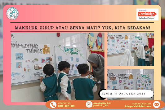 Pada hari Senin, 6 Oktober 2025, anak-anak TK B Al Siddiq International School mengikuti kegiatan klasifikasi Living Things dan Non-Living Things di kelas Literasi. Kegiatan ini menjadi bagian dari pembelajaran tematik yang sedang berlangsung, yang bertujuan mengenalkan konsep dasar sains kepada anak usia dini melalui aktivitas yang menyenangkan dan aplikatif.