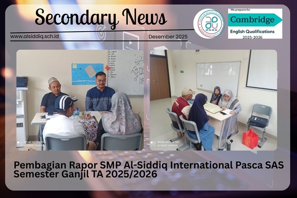 SMP Al-Siddiq International melaksanakan kegiatan pembagian rapor pasca Sumatif Akhir Semester (SAS) Semester 1 Tahun Ajaran 2025/2026 pada hari Jum’at, 19 Desember 2025. Kegiatan ini dimulai pukul 07.30 WIB dan berlangsung di ruang kelas masing-masing sesuai jenjang dan rombongan belajar.
