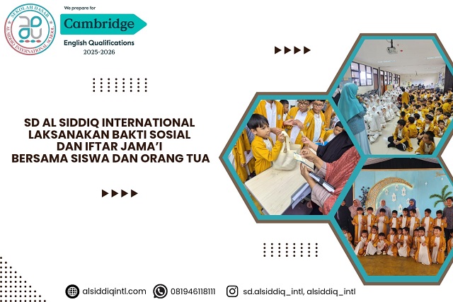 SD Al Siddiq International menyelenggarakan kegiatan Bakti Sosial dan Iftar Jama’i yang melibatkan seluruh siswa serta orang tua siswa pada Jumat, 6 Maret 2026. Kegiatan yang berlangsung mulai pukul 13.00 hingga selesai ini dilaksanakan di lingkungan SD Al Siddiq International dengan penuh kebersamaan dan semangat berbagi di bulan suci Ramadan.