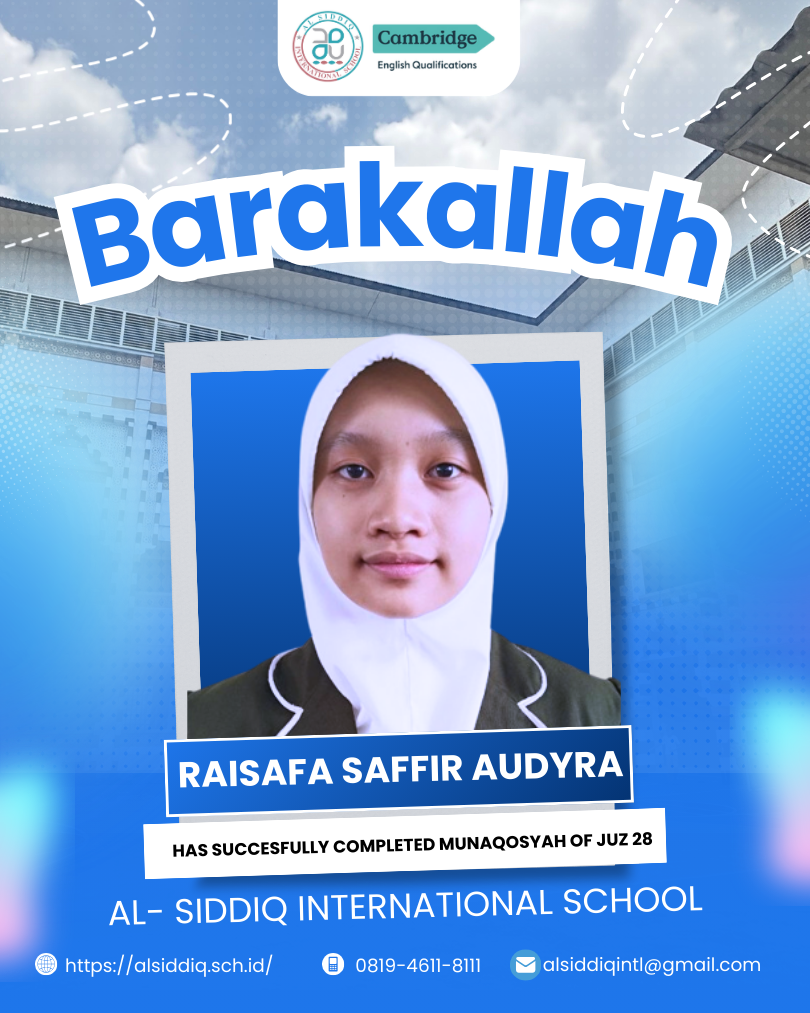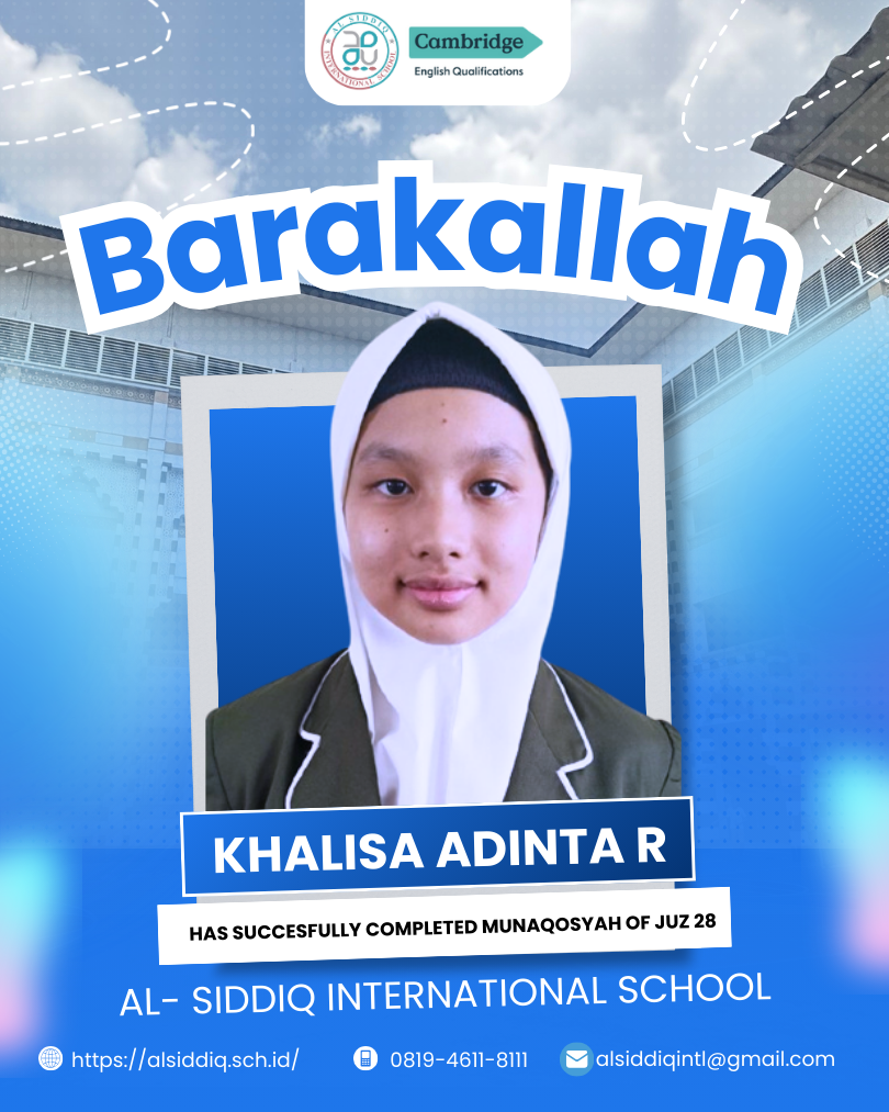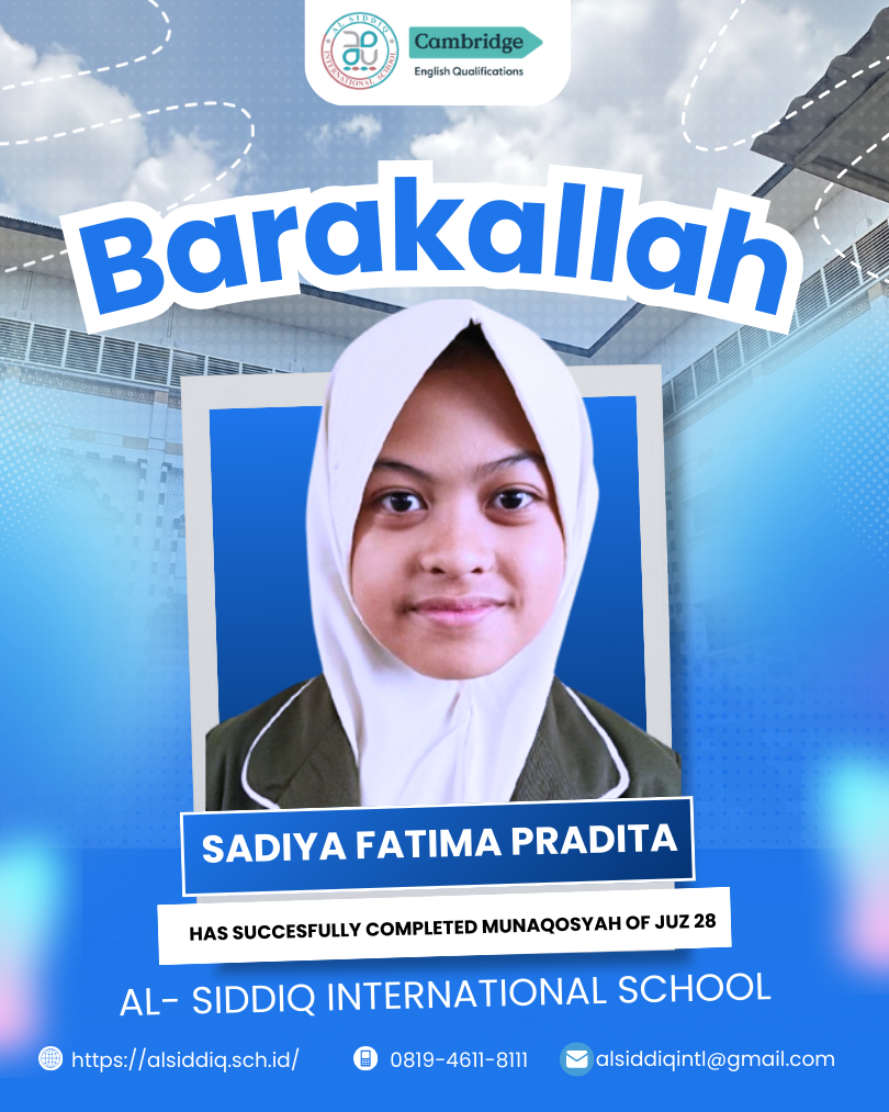 SMP Al Siddiq International adalah sekolah jenjang menengah pertama yang didirikan pada tahun 2023. Sekolah ini mengambil tagline “The Quranic School for Glorious Future” . Ide besar ini diambil sejalan dengan target hafalan Al Quran di SMP Al Siddiq International yaitu 15 Juz selama 3 tahun. Program unggulan selain Al Quran 15 yaitu program bilingual/dwi bahasa. Dimana dalam program ini hampir semua pelajaran di sajikan dalam bentuk penjelasan menggunakan dua bahasa tadi. Kami bagi menjadi dua cluster : untuk cluster Umum semisal pelajaran IPA dan Matematika di ajarkan dengan pengantar dan buku ber-Bahasa Inggris. Untuk cluster KeIslaman diantarkan dalam Bahasa Arab. Hanya pelajaran Bahasa Indonesia saja yang diantarkan dalam Bahasa Indonesia.